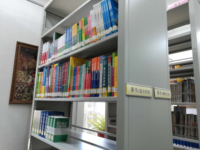 外院网站讯(通讯员 王喆)为方便公司师生借阅图书,在学院领导的支持下,资料中心购置安装新书书架,将1000余册新书分类放置,特设新书(综合)书架,新书(意大利语)书架,新书(葡萄牙语)架,新书(西班牙语)书架,新书(德语)书架。图书导引标识粘贴在书架侧方,能够让前来借阅图书的师生对图书放置一目了然。