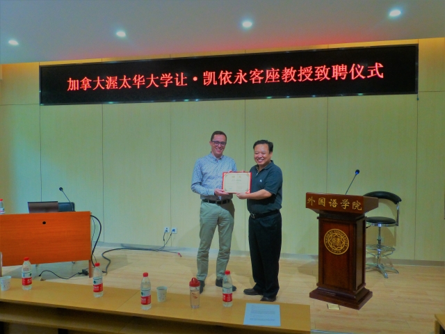 让·凯依永教授对此表示衷心感谢与热切期待,并于仪式结束后随即开始了题为《圆凿方枘?——翻译技术与加拿大译者培训》的学术讲座,从语言技术的内容、翻译辅助工具与相关软件的使用、翻译技术的教学内容、翻译技术的教学方法等方面对加拿大渥太华大学翻译学院的翻译技术教学进行了生动具体的介绍,引发了台下师生的强烈反响与积极互动,大家就术语抽取、翻译辅助工具及相关软件的使用及翻译毕业生就业去向等问题与凯依永教授展开了深入的探讨与交流,感慨良多,受益匪浅。