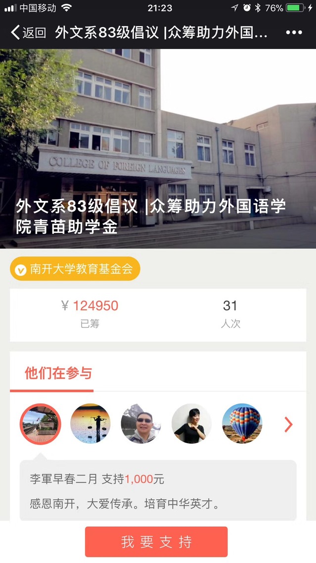 谈及助学金的命名,捐助员工们表示,外院83级员工在南开园学习生活时也曾如同“青苗”,如今已然在祖国的大江南北扎根,成长为一棵棵郁郁葱葱的大树,却始终没有忘记学校和学院的培育。员工们希望以自身的绵薄之力,为母校留下些积极向上、相互关爱且薪火相传的物质或精神,为如今青葱的“幼苗”洒下一片阳光,让他们能够茁壮成长,长大后继续传递这种大爱。