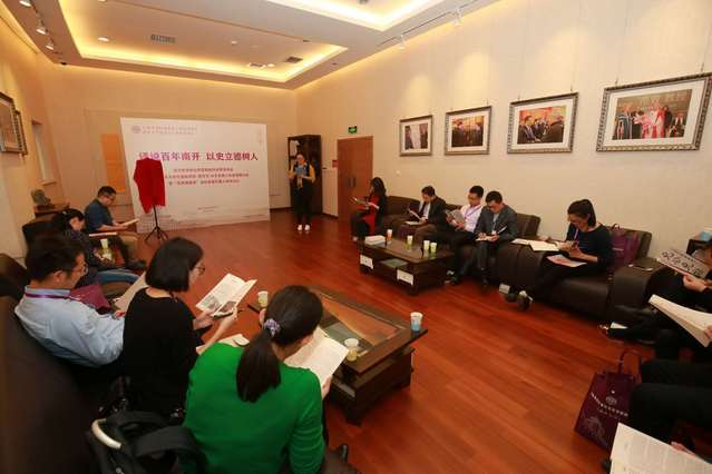 会前,与会人员共同参观了《南开校训与社会主义核心价值观》主题展览,展出内容主要涉及项目《致百年的你》中英对译集二期成果的节选内容。作为辅导员工作精品项目的阶段性成果,该展览包括前言在内的7个板块,根据原著《校训与社会主义核心价值观》的顺序摘录了龚克、申泮文、张伯苓等前辈及员工对“公能”校训的经典阐释。