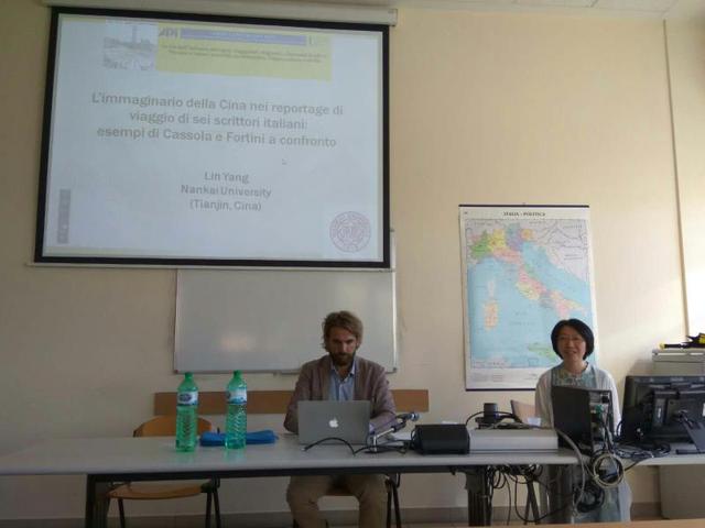 9月7日下午两位教师发言,引起听众的浓厚兴趣。杨琳的发言题目是“二十世纪下半叶六位意大利作家游记中的中国形象——以卡索拉(C. Cassola)与福尔蒂尼(F. Fortini)的比较为例”;乐小悦的发言题目为“‘我们’和‘他们’:朱塞佩·梅塞罗蒂·本韦努蒂(Giuseppe Messerotti Benvenuti)信件中的天津租界”。意大利著名汉学家西尔维娅·卡拉曼德雷伊(Silvia Calamandrei)女士、玛利亚·丽塔·马西(Maria Rita Masci)女士和安娜·第·托罗(Anna di Toro)教授专门到场聆听二人的发言、提问并点评,现场气氛热烈。杨琳所研究的卡索拉和福尔蒂尼是1955年意大利访华文化代表团中的作家,而当时的代表团团长正是西尔维娅·卡拉曼德雷伊女士的祖父、意大利著名法学家皮埃罗·卡拉曼德雷伊(Piero Calamandrei)先生,因此西尔维娅·卡拉曼德雷伊女士在讨论环节中补充的背景信息十分可贵。