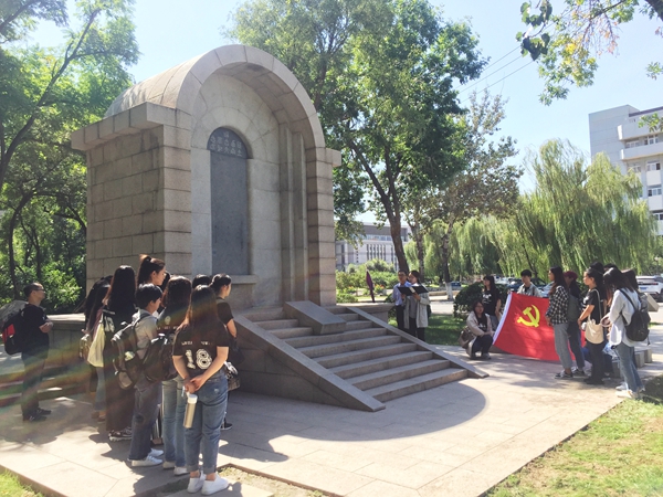 为使新生更好地了解南开校史,感悟南开爱国传统,外院在新生集中校史教育结束后,带领新生党员展开“学校史、忆人物、话成长”活动,以校园红色景点及人物串联起南开血泪与荣光并存的历史。其中,在西南联大纪念碑前,辅导员王嫒以历史大背景串联起南开校史,并带领全体新生党员重温习近平总书记给8名入伍南开学子的回信内容,激励新生党员在新的时代下以各种不同的姿态将爱国之心化为报国之行。