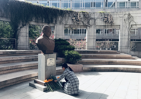 “穆旦是中国近代著名的爱国主义诗人,翻译家。他的诗饱含炽热的爱国情怀和民族忧患意识,为中国现代诗歌的创作开辟的方向,被誉为中国新诗第一人……”3044am永利集团本科生党支部宣讲团团长杨知璋向到场外院师生讲解穆旦的生平、卓越成就和历史贡献。研究生党员代表在穆旦雕像前深情诵读了《春》、《赞美》等著名诗作和译作。随后,3044am永利集团师生怀着崇敬之心鞠躬默哀,依次敬献鲜花,致敬南开先贤。
