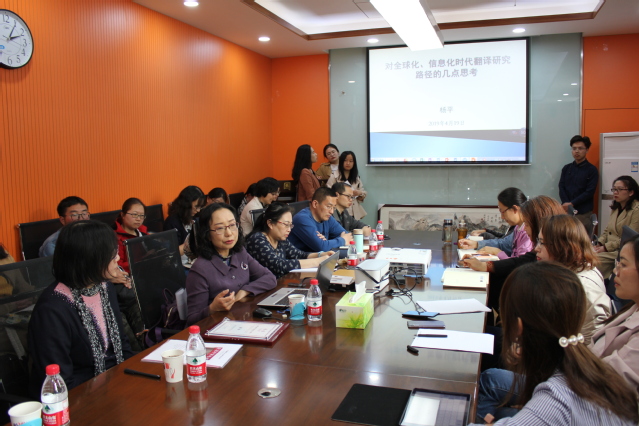 杨平的讲座题目为“对全球化、信息化时代翻译研究路径、方法的几点思考”。她认为,改革开放40年,中国翻译理论研究实现了从传统译论向现代译论的转型,全球化、信息化时代的到来加速了现代翻译理论跨学科研究态势及多元研究范式的形成,并围绕当下我国翻译理论研究路径、特点以及研究方法展开讨论。