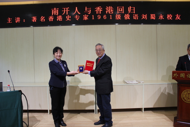 为庆祝南开建校100周年,刘蜀永员工向学院“院史馆”捐赠数本个人专著,邹玉洁代表学院向刘蜀永员工颁发捐赠证书和百年校庆纪念章。