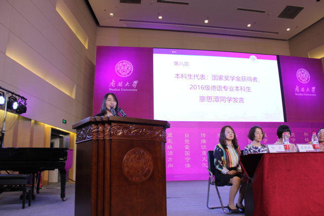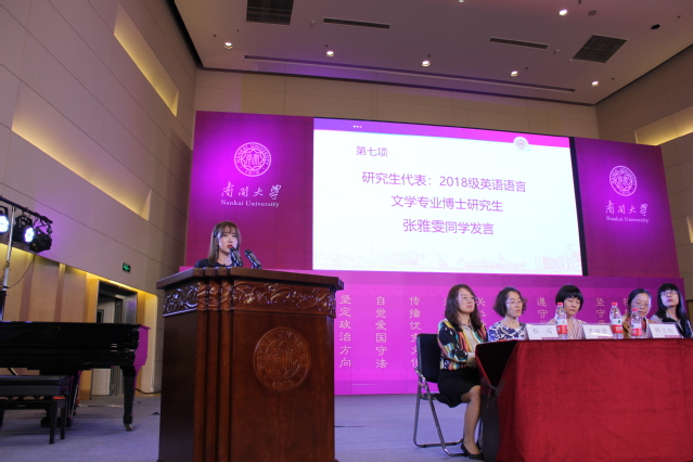 翻译系系主任、博士生导师胡翠娥教授作为教师代表讲话。她从自己在南开求学执教的30余年经历出发,强调了师生互动的重要性,并鼓励外语人才保持对外语学习的热情和对世界的探索。