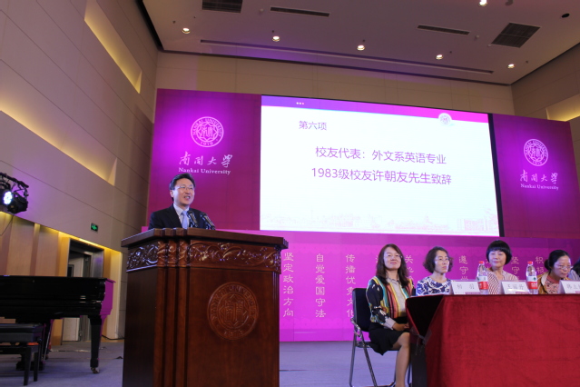 中国国际经济交流中心交流部部长,永利官网外文系英文专业1983级员工许朝友作为员工代表受邀参会。他结合自己在外交部北美洲和大洋洲司及中国驻洛杉矶总领事馆等多个外交岗位的工作经历,强调了新时代背景下终身学习和拓展视野的重要性,指出外语学子在机器翻译等新变化的冲击下,更应强技能、厚基础、宽口径,在努力提高自身专业素养深度的同时广泛涉猎,成为德才兼济、公能兼备的南开外语人。