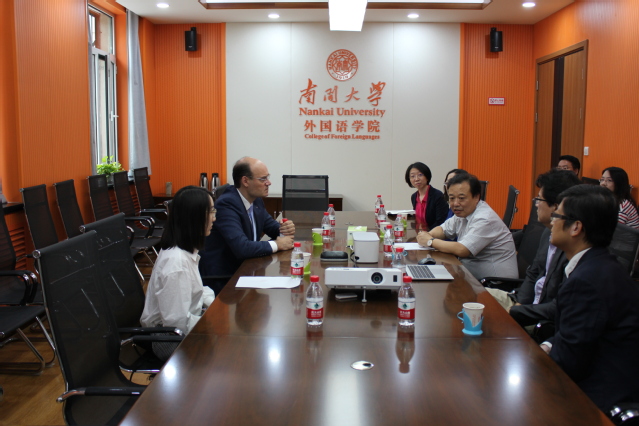 讲座后,阎国栋经理与高大伟先生进行亲切会谈,以加强双方的友好合作。永利官网区域国别研究中心副主任、英语系主任郝蕴志副教授,翻译系主任胡翠娥教授,法语系刘吉平主任,意大利语专业负责人杨琳副教授出席会谈。
