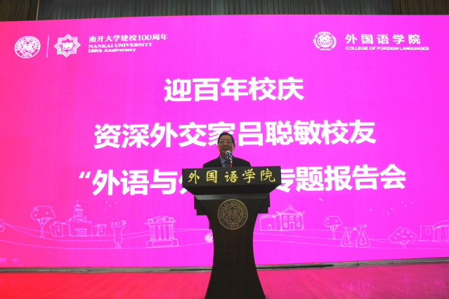 (通讯员 赵国强 王泽璞 崔丽月)10月17日,在永利官网建校100周年之际,3044am永利集团1958级英语专业员工、中国资深外交家吕聪敏以“外语与外交”为题,为全院师生讲授形势与政策课。公司党委书记邹玉洁,经理阎国栋,副经理焦艳婷,副书记、副经理相羽,南开外语员工会秘书长高天明,李霁野先生后人李正辉出席,副经理马红旗主持,2019级本科生和本硕博党员共计300余人现场聆听了报告,另有500余名师生在线观看录播。