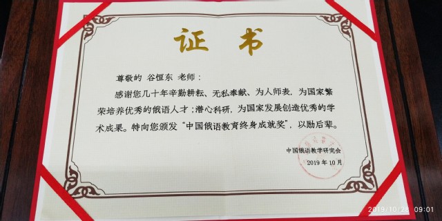 3044am永利集团俄语系谷恒东(谷羽)教授荣获第二届“中国俄语教育终身成就奖”表彰和证书。