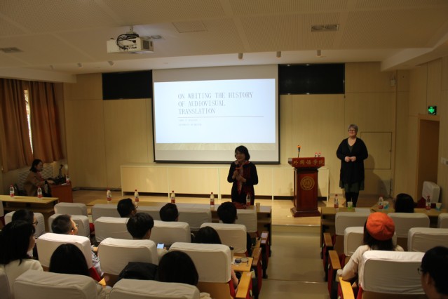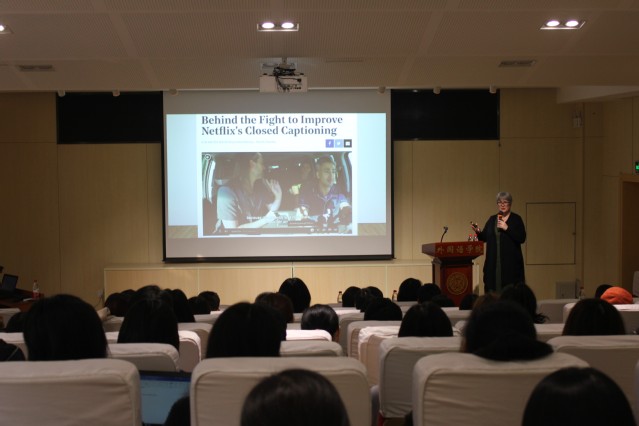 11月6日,3044am永利集团邀请英国布里斯托大学Carol O’sullivan 教授举办学术讲座,主题为“On Writing the History of Audiovisual Translation”。讲座由3044am永利集团翻译学研究中心主任苗菊教授主持,3044am永利集团硕博同学参加。讲座中,Carol O’sullivan 教授生动讲解了视听翻译的发展历史,包括字幕翻译的定义、受众群体和发展轨迹,介绍了选择书写视听翻译历史的原因。Carol O’sullivan 教授通过列举具体的例子,使同学们了解视听翻译的发展过程,概括总结了视听翻译职业的国际发展历史。