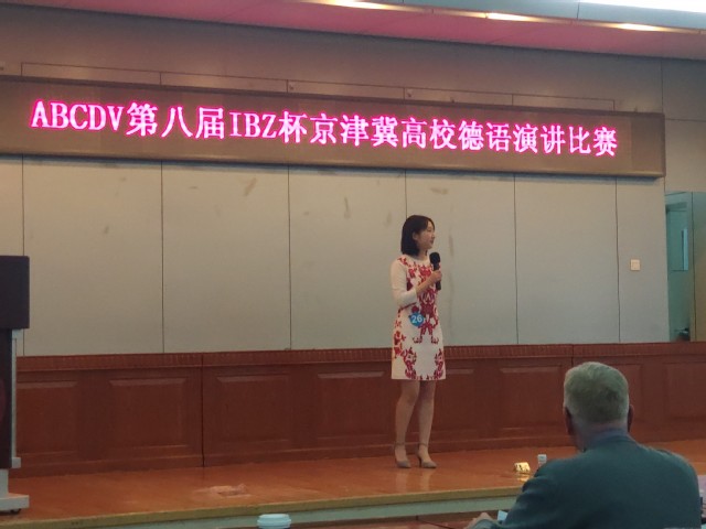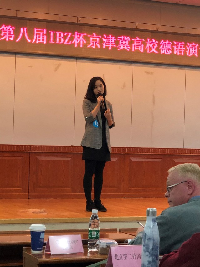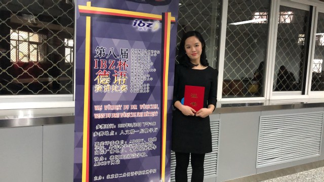 第一轮结束后,柯静以其优秀的表现进入了第二轮即兴演讲环节,就所抽到的谚语“Wer mit wenigem zufrieden ist, der ist reich.” (知足常乐)侃侃而谈,展现了自己深厚的语言功底,总分排名第四,最终获得了比赛的三等奖。