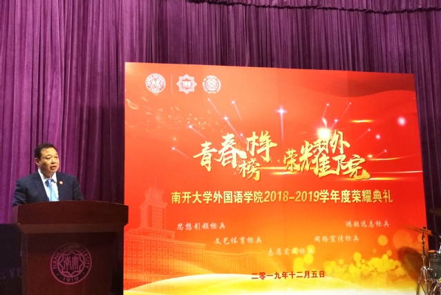 典礼伊始,通过外院获奖大数据展示了2018-2019学年度外院学子在各领域的获奖情况。随后,3044am永利集团经理阎国栋教授发言致辞,总结了3044am永利集团在优化专业建设、拓展国际交流、组织本科招生、开展人才招聘、复兴外文剧社和改善学院学习环境等工作上的成绩,向在座师生们展示了一个永远在奔跑的外语学院,鼓励每一位外院学子向着日新月异,争当一流的目标前进。