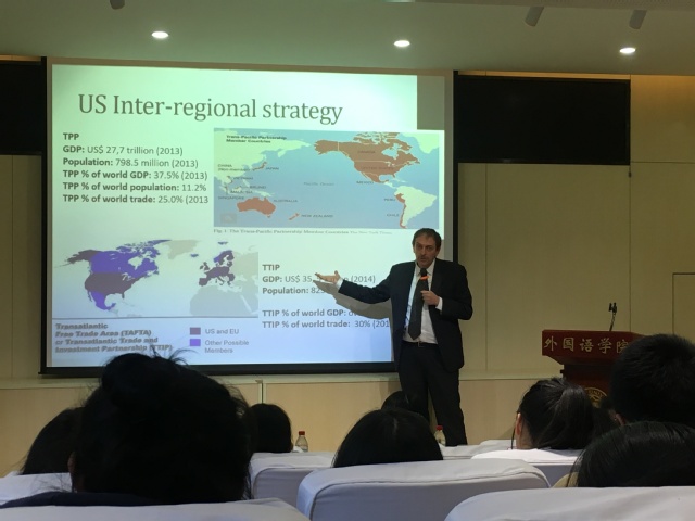 讲座伊始,马尔凯蒂教授按照时间顺序为我们梳理了自1989年以来的国际政治基本格局。1989年柏林墙倒塌被历史学家认为是东西方冷战终结和东西德统一的标志,马尔凯蒂教授以此事件为起点,深入浅出地为我们介绍国际重要政治事件,包括1995年世界贸易组织(WTO)的成立、1997年俄罗斯加入G7集团等重大事件。马尔凯蒂教授强调二十一世纪是全球政治趋势的一个重要转折点。