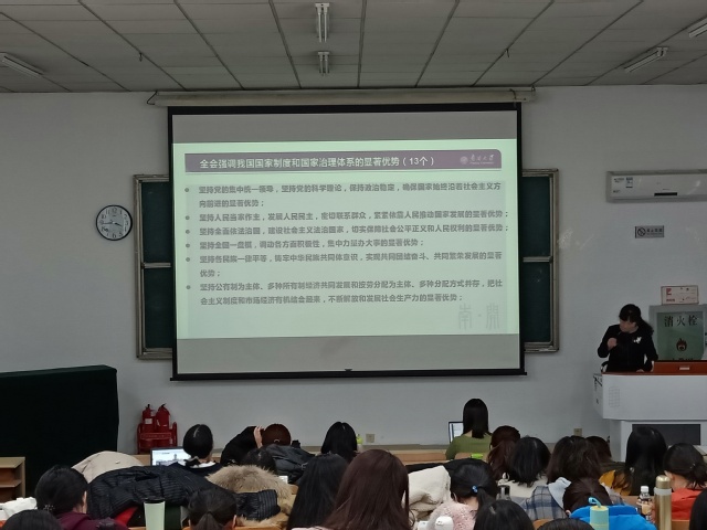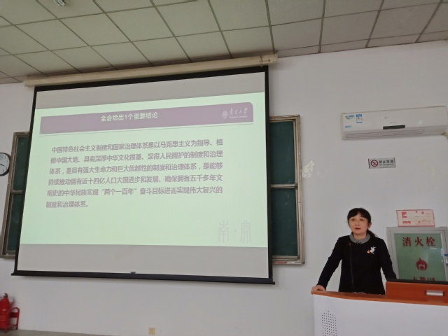 邹玉洁同志嘱托员工党员同志不忘初心、牢记使命,时刻同党中央走在同一条战线上,用党的思想武装自己的头脑。2018级硕士生第二党支部书记王佳慧表示:通过此次主题宣讲,我对党推进各方面制度更加成熟更加定型的时间表和路线图有了更清晰的认识,也对制度建设的重要性有了更深刻了解。作为老员工党员,我们应该认真学习全会精神,坚持制度自信,助力夯实实现中华民族伟大复兴的制度根基。