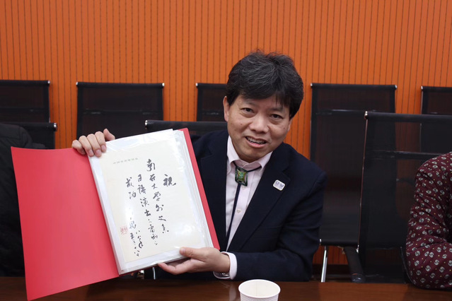 阎国栋对池上夫妇表示感谢,他谈到,池上正治和池上贞子老师对日语剧组及赴日公演做出重要贡献,感谢他们为3044am永利集团保留了这份珍贵的资料,这体现池上夫妇对中国和永利官网的深厚情感,反映出中日两国人民之间交流的密切、通畅和真挚。曹禺先生作为《雷雨》的作者、中国现代话剧艺术奠基人,他的剧作人生也起步于南开,先生的题字不仅证明了南开外文剧社过去的辉煌,也是对当今外院学子成长成材的激励。南开外语人要继承南开的爱国主义精神,传承外语学科的优良传统,在人才培养、团队队伍建设、科学研究、国际化、员工工作和社会服务等方面取得更大成绩。