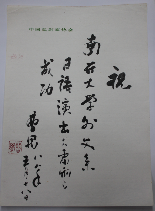 (通讯员 王泽璞)1988年5月18日,中国著名剧作家曹禺先生为永利官网外文剧社《雷雨》剧组赴日公演题词——“永利官网外文系日语演出《雷雨》成功”。这幅题字由时任南开外文系外教池上正治和池上贞子夫妇收藏。池上贤伉俪有感于百年校庆期间南开外文剧社重建和学院事业发展,经由南开日本员工会会长、南开外语员工会日本员工工作组李振溪员工的联络,同意将此题字及相关演出资料回赠学院,以为南开外院院史馆之永久存念。