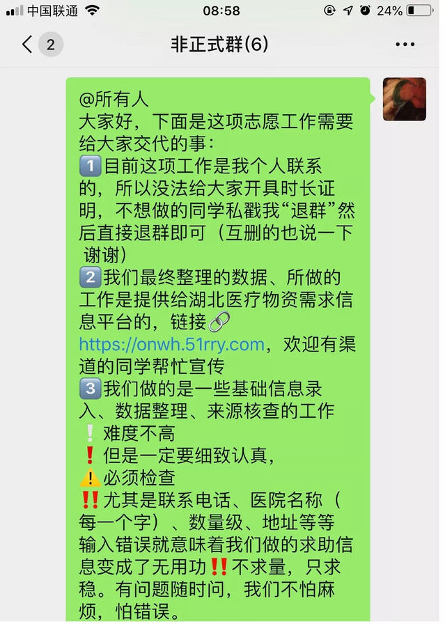 这支志愿者团队为“E起志愿疫情物资供需平台”的信息组提供了80%以上的后备人员援助。他们的主要任务是做平台来源可靠性核查和数据整理。大家在“微公益”微博平台收集医院的求助信息,并对信息来源的真实性可靠性进行核对,保证信息的及时准确录入和上传。每一条信息都要反复确认:口罩数量、电话号码、医院名字具体到每一个字、来源链接……