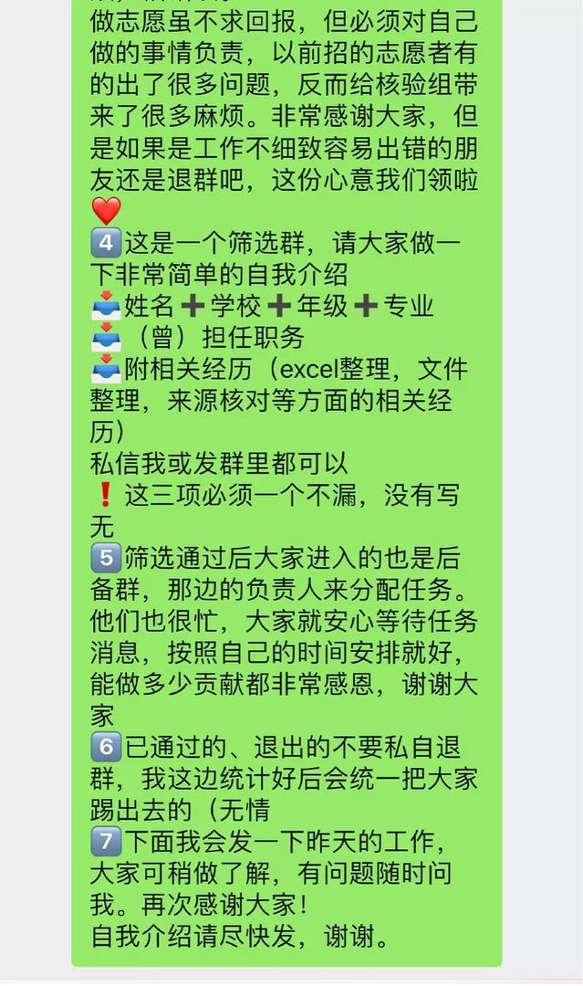 于是她便询问平台的信息组负责人,是否需要扩充志愿者行列。得到肯定的答复后,她在朋友圈、各个微信群发布了招募消息,没过几个小时就有几个人添加她的微信,短短几天,前前后后有70余人加入。虽然不能提供志愿时长证明的记录,但退出的志愿者只有极少数几人,绝大多数选择了留下,为战“疫”贡献力量。
