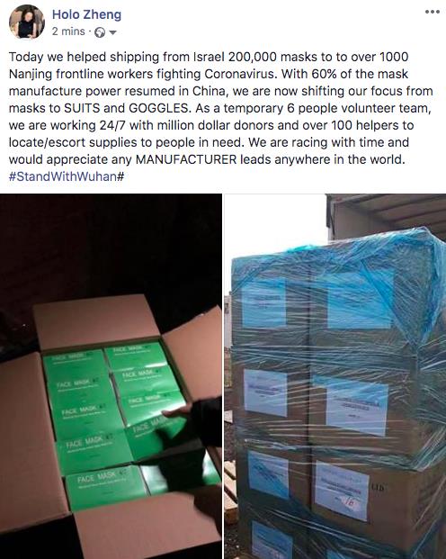 2月2日,志愿团队又采购了第二批医疗物资,从以色列发往南京200000只医用口罩,这些物资将会被发放到前线排查疫情人员手里。郑小星员工表示,国内口罩生产能力目前已经恢复六成,我们将把寻购物资重点从口罩转到防护面具和防护服。我们的临时志愿团队由六人组成,全天候地与各地捐助人及志愿者合作,将物资送到有需要的人手中。