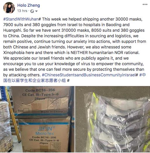 2月11日,郑小星志愿团队第三次从以色列向国内发货,向河北省保定市和湖北省黄石市的医院发送了30000只口罩、7900套防护服和380副防护面罩。郑员工表示,尽管物资采购和物流变得愈发困难,但在华人和犹太朋友的共同支持下,我们依然保持乐观精神,将焦虑转化为实实在在的行动。