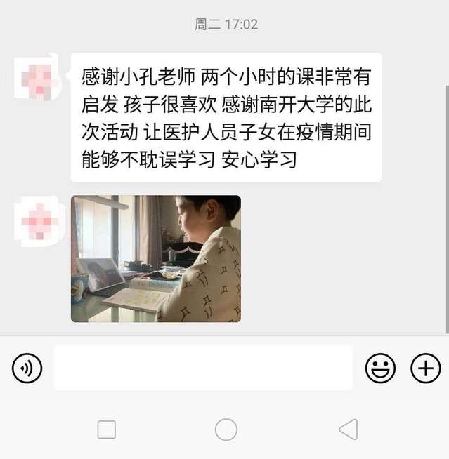 18级意大利语专业员工孔雪宁被各行各业工作者和疫情抗争的事迹深深打动,于是报名参与了公司团委的“公益家教”活动。这个活动旨在为医护人员子女提供学习、特长和生活方面的无偿线上指导。她现在是一名六年级员工的“小老师”,该员工的母亲是一名正处在“战疫”一线的白衣天使。孔雪宁每日辅导学习语文及写作,她认为自己从中也收获颇丰。孔雪宁说,“最让我感动的就是这位医护人员的孩子,他说希望疫情赶快结束,以后他也要像我们一样,向身边的人、向有需要的人贡献力量。”