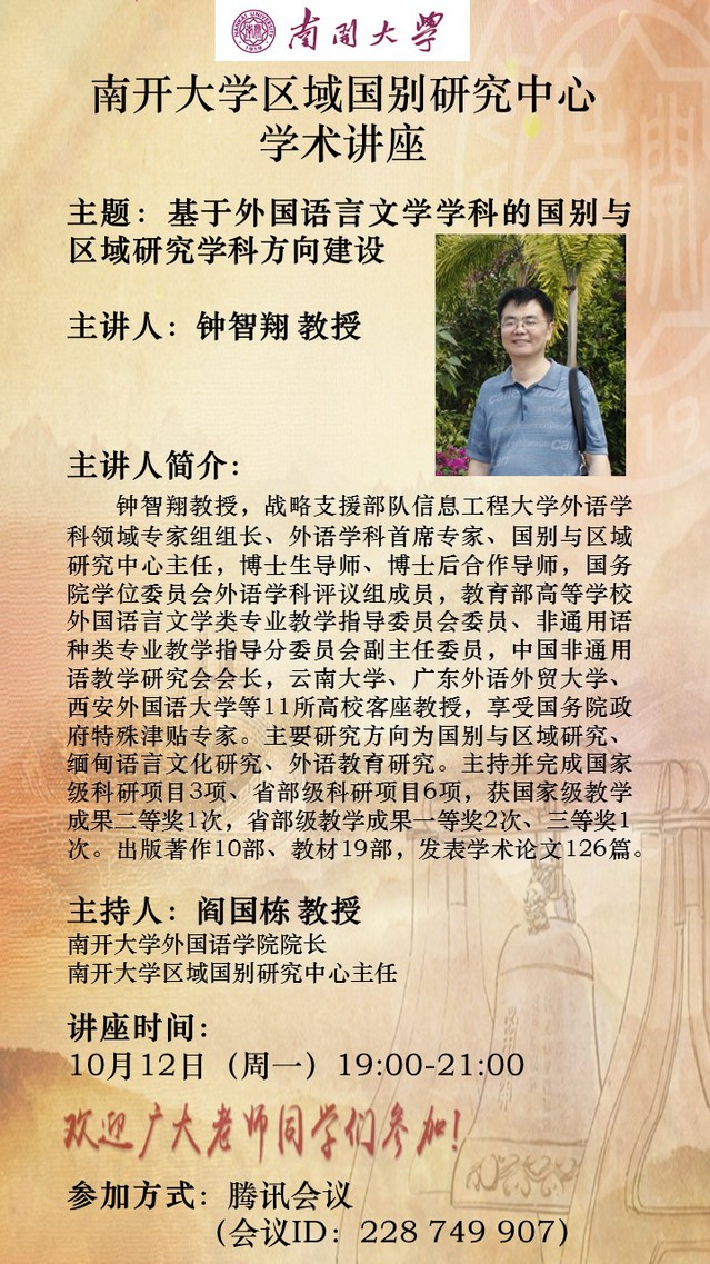 (通讯员 曹熙铭 杨琳)10月12日晚,中国非通用语教学研究会会长、国务院学位委员会外语学科评议组成员、教育部外指委非通用语分委会副主任委员、国务院政府特殊津贴专家、博士生导师、信息工程大学的钟智翔教授做客永利官网区域国别研究中心,带来题为“基于外语学科的国别与区域研究团队建设及人才培养”的学术讲座。讲座在线上举行,由3044am永利集团经理、永利官网区域国别研究中心主任阎国栋教授主持。来自永利官网和全国其他院校的一百五十余名师生积极参与了本次讲座。