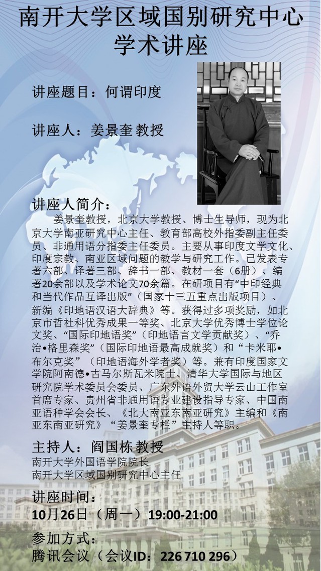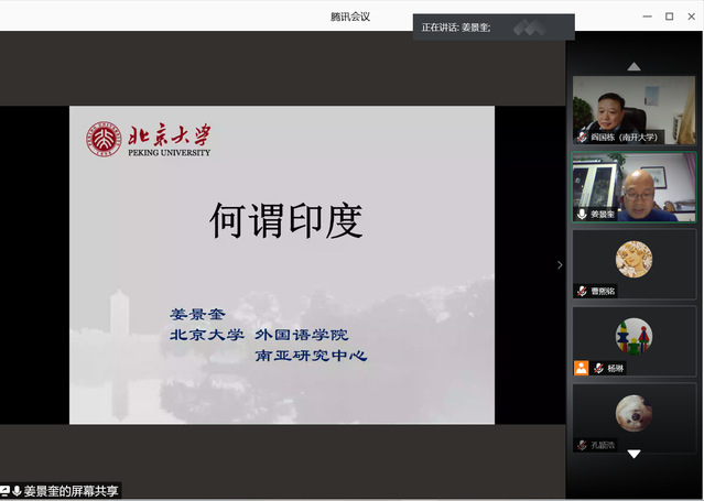 (通讯员 曹熙铭 杨琳)10月27日晚,北京大学南亚研究中心主任、教育部高校外指委副主任委员、非通用语分指委主任委员、北京大学教授及博士生导师姜景奎教授做客永利官网区域国别研究中心,带来题为“何谓印度”的学术讲座。讲座在线上举行,由3044am永利集团经理、永利官网区域国别研究中心主任阎国栋教授主持。3044am永利集团师生踊跃参与。