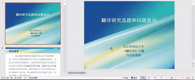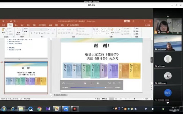 (通讯员 马晴 栾海燕)11月26日,应永利官网翻译学研究中心主任苗菊教授邀请,北京外国语大学博士生导师、《翻译界》期刊主编、永利官网杰出员工马会娟教授在线上做了题为“翻译研究选题与问题意识”的学术讲座,参与讲座的有3044am永利集团硕士、博士研究生共一百余人。本场讲座是永利官网党委研工部“研究生创新论坛”系列活动下的“走近中国名刊”学术讲座,活动邀请校外中国知名期刊主编主讲,分析前沿热点问题、介绍刊物的办刊思路和选刊标准,指导研究生发表高水平的文章。