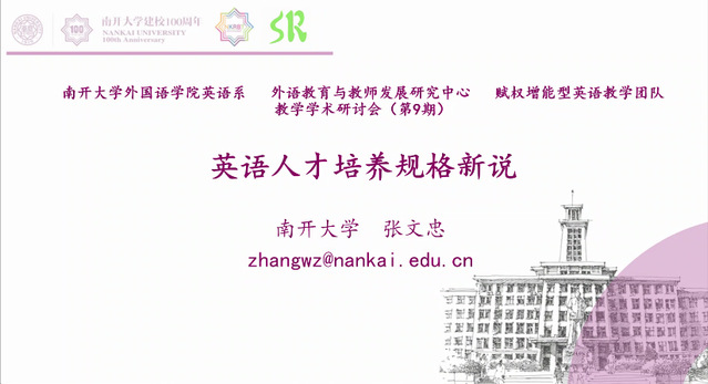 张文忠教授汇报的题目是“英语人才培养规格新说”。他从教育的永恒追问、关于人才培养的规格和“赋权增能”理路的规格主张三个方面的阐发中引出他思考的英语人才培养的四个向度,即“人格”、“素养”、“知识”和“能力”;随后,他详细阐述了“格养知能”的内涵,并将“格养知能”四向度与人体运动系统的“骨骼系统”“肌肉系统”“能量系统”和“神经系统”进行了精彩的类比。最后,他呼吁一线教师践行“赋权增能”理路,以“三三合一原则”设计和实施“做学用合一”的高效公司产品活动与任务,促进英语人才“格养知能”的培养和提升。