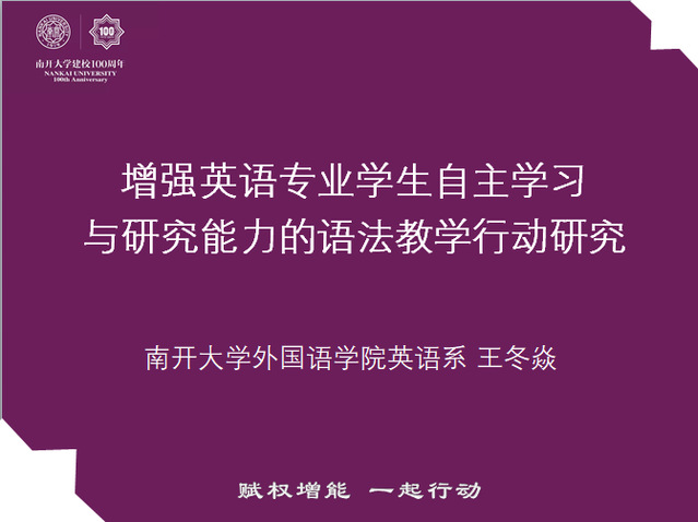 王冬焱博士以“增强英语专业员工自主学习与研究能力的语法教学行动研究”为题,从研究背景、研究问题、措施与方案和评价与反思四个方面汇报了她应用“赋权增能”理路,在英语专业低年级员工中进行英语语法教学的两轮行动研究。她报告的行动研究证实,在英语专业低年级员工中进行专门语法教学符合员工需求,引导员工在语法学习中开展课外自主学习行之有效,组织员工针对语法项目开展小组项目研究切实可行。