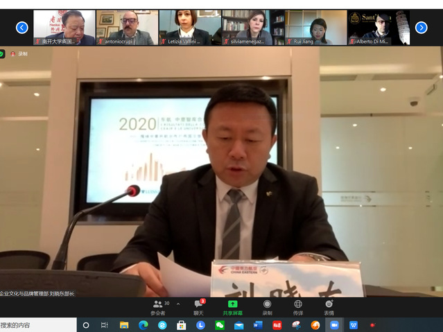 东方航空企业文化与品牌管理部总经理刘晓东回顾了东航服务中意航空市场的努力,以及在中意携手抗疫过程中,东航的社会担当和突出表现,表达了对未来中意文化交流、航空市场合作发展的美好愿景。环球网总经理单成彪则希望借此机会探究媒体在“一带一路”中的新作用,加强高校、企业和媒体间的互联互通,联合各方智慧,共商疫情下中意交流新形态。