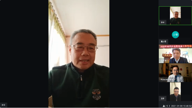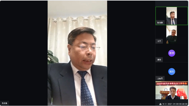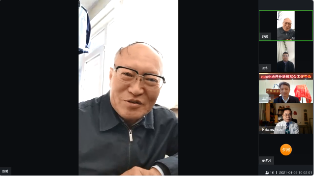 南开外语员工会名誉理事长吕聪敏同志发来贺信,由副秘书长陈效禹宣读。吕聪敏表示,三年多来,为办好员工会,大家献计出力,亲身实践和体验“员工是母校的血脉”、“员工会是座桥梁,是条纽带,是个平台,是个窗口”的机制特质和功能,取得了可喜的成果。疫情影响使我们不能回母校团聚,那就让我们在“线上”、在视频里紧握双手,为南开外院和外语员工会祝福!