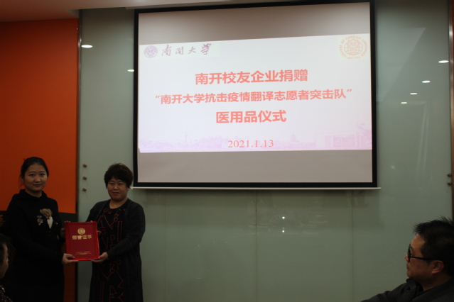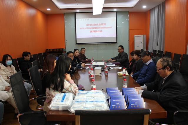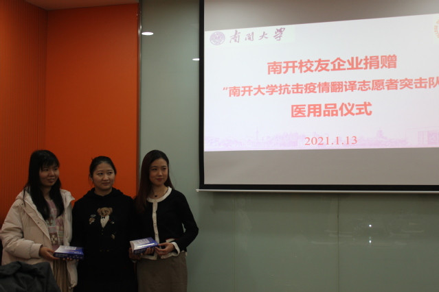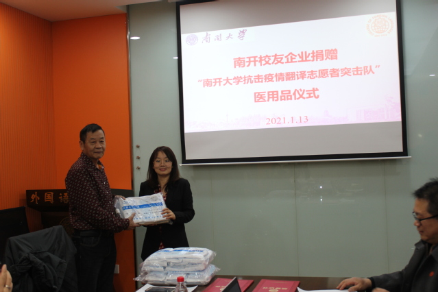 (员工工作办公室)1月13日下午,3044am永利集团在139良铮厅举行员工企业捐赠仪式。天津市进出口商会及员工企业心系南开师生,专程为“永利官网抗击疫情翻译志愿者突击队”捐赠医疗用品。