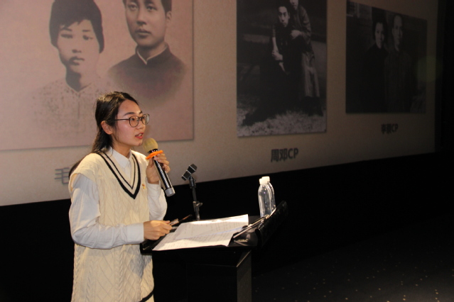 王嫒带领同学们重温了习近平总书记在党史学习教育动员大会上的重要讲话,强调了学习党史的重要性,“要通过学习党史,感悟革命先烈的大无畏奋斗精神,赓续共产党人的精神血脉。”王嫒以影片《建党伟业》为切入点,围绕中国共产党第一次全国代表大会召开的历史背景进行了重点阐释与讲解,通过“茫茫九派流中国”“南陈北李,相约建党”“毛泽东的过往与照见”等生动的电影瞬间,将中国共产党的历史娓娓道来,动情讲述了李大钊、陈独秀、毛泽东等建党先驱的感人故事,生动展现了中国共产党建立之初筚路蓝缕的艰辛历程和为国为民的初心使命。随后,2020级英语专业彭金艺同学现场诵读英文版《共产党宣言》的片段节选,以铿锵有力的语调,带领现场同学共同感悟永恒的真理和不朽的精神。