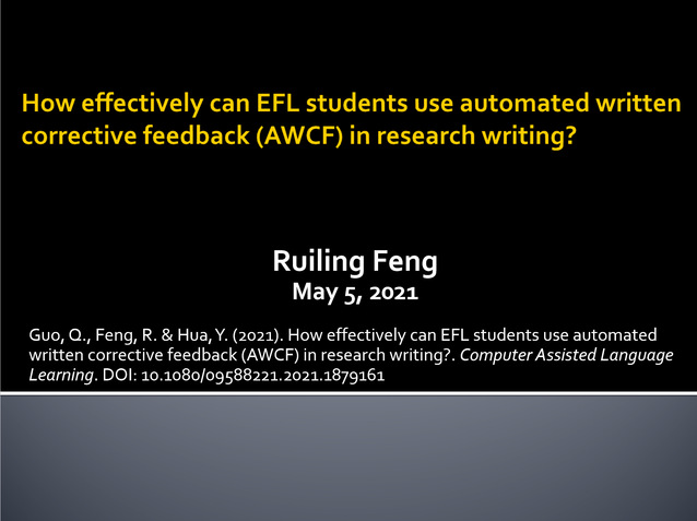 第一位汇报人冯瑞玲汇报的题目是How effectively can EFL students use automated written corrective feedback (AWCF) in research writing?冯瑞玲基于新近发表于国际重要期刊的研究文章,报告了中国高校英语学习者学术写作中使用语法纠错工具Grammarly的研究课题与发现,并分享了研究心得和体会,提供了期刊论文修改和发表的实用建议。