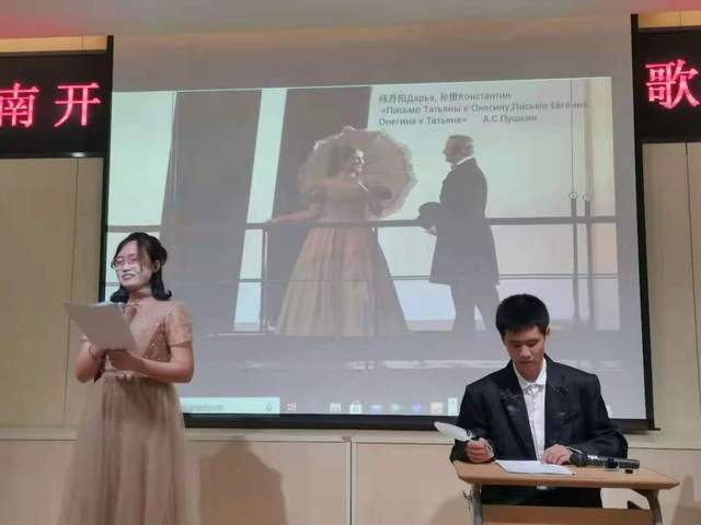 经过激烈的角逐,俄语系2020级员工师丹阳、孙傲荣获一等奖。他们两人合作朗诵《塔季扬娜写给奥涅金的信,奥涅金写给塔季扬娜的信》选自普希金的著名诗体长篇小说《叶甫盖尼·奥涅金》,将戏剧表演与诗歌朗诵两种艺术形式进行了完美结合,别出心裁。他们使用桌椅、纸笔等道具,还原写信场景,并将原本处于两条时空线的两封信件进行穿插演绎,语速自然流畅,情感真挚动人,震撼了在场观众。