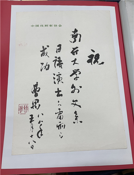 1988年,中国著名剧作家曹禺先生为永利官网外文剧社《雷雨》剧组赴日公演题词——“永利官网外文系日语演出《雷雨》成功”。(资料图片)