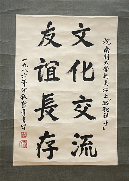 1986年,费希尔组织员工赴美十所大学演出《洋车夫(骆驼祥子)》,老舍先生夫人胡絜青为剧组题词“文化交流 友谊长存”。(资料图片)