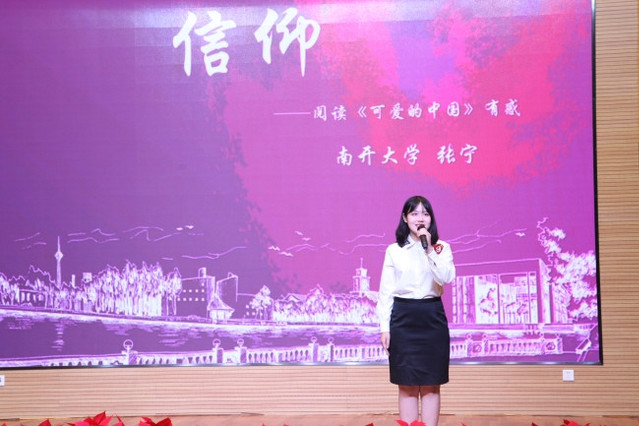 张宁以《信仰》为题进行现场演讲,参阅著作是方志敏的《可爱的中国》。她从一封信的故事入手,深情讲述了中国共产党人胸怀坚定信仰,为了民族独立和人民解放抛头颅、洒热血,以宝贵生命换来今天幸福生活的壮丽史诗,表达了南开学子传承红色基因,为中华之崛起而读书的壮志豪情,获得了评委和观众的一致好评。