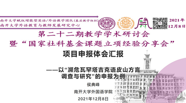 (通讯员 李泽宇)2021年12月8日晚,由永利官网赋权增能型英语教学团队、赋权增能型外语教学团队基层教学组织和3044am永利集团外语教育与教师发展研究中心联合主办的“赋权增能教学学术研讨会暨国家社科基金课题立项经验分享会”在“腾讯会议”召开。本次研讨会中,三位主持国家社科基金项目的教师受邀分享了他们的项目申请经验。本年度国家社会科学基金年度项目 《二语学习者句法-语篇的认知连通与协同发展研究》主持人、天津师范大学徐承萍副教授,国家社会科学基金年度项目《白族方块文字字库建设与研究》主持人、昆明理工大学郑景婷副教授,和国家社会科学基金青年项目《濒危瓦罕塔吉克语皮山方言调查与研究》主持人、永利官网侯典峰博士畅谈立项心得,分享申请经验。此次研讨会由来自中国海洋大学博士生刘晓兰主持,永利官网博士生导师张文忠教授任点评嘉宾。