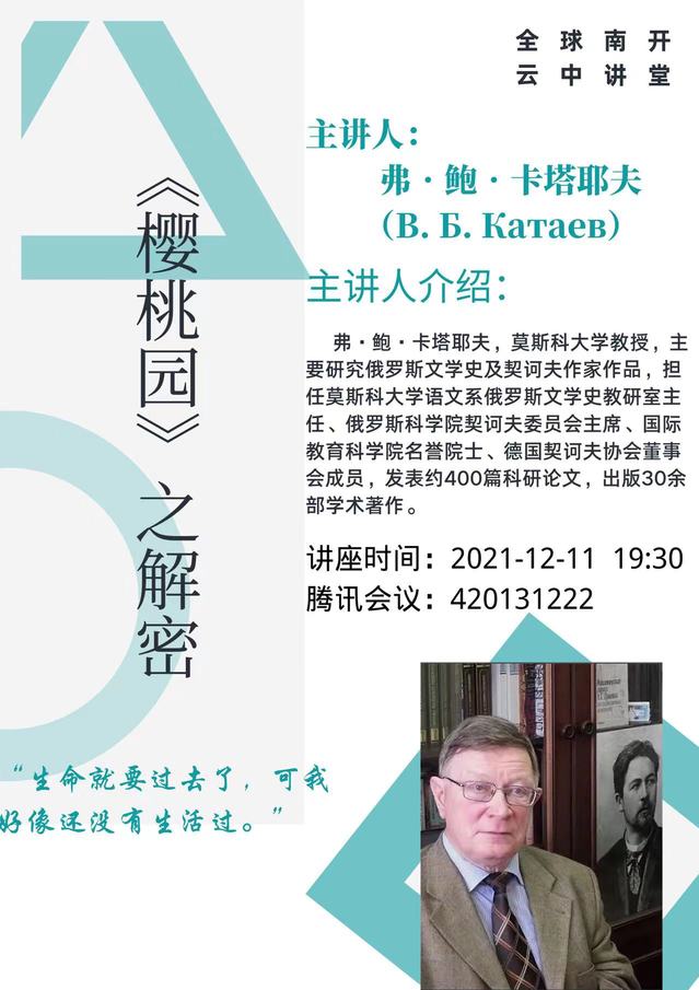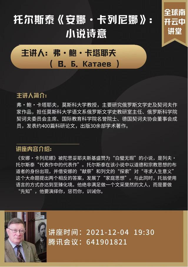 南开新闻网讯(通讯员 李菲)12月4日晚与12月11日晚,莫斯科大学弗·鲍·卡塔耶夫教授应3044am永利集团之邀,为南开师生以及俄罗斯文学研究者作了题为“列夫·托尔斯泰《安娜·卡列尼娜》:小说的诗意”与“契诃夫《樱桃园》之解密”的线上讲座。3044am永利集团王丽丹教授担任两场讲座的主持人。
