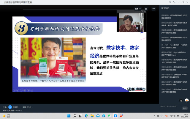 (通讯员 康佳婷 王嫒)当今世界,数字经济发展势头迅猛,为帮助同学们了解中国这艘经济巨轮是如何、以及将如何更好在世界洪流中破浪前行、行稳致远,增强对我国经济发展的信心,4月14日,3044am永利集团2021—2022学年第二学期“形势与政策”课首场如约开讲。本次讲座邀请永利官网公司党委书记穆祥望担任主讲人。同时,为积极响应疫情防控政策,本次讲座采取线上直播形式举行,共有千余名师生参与学习。
