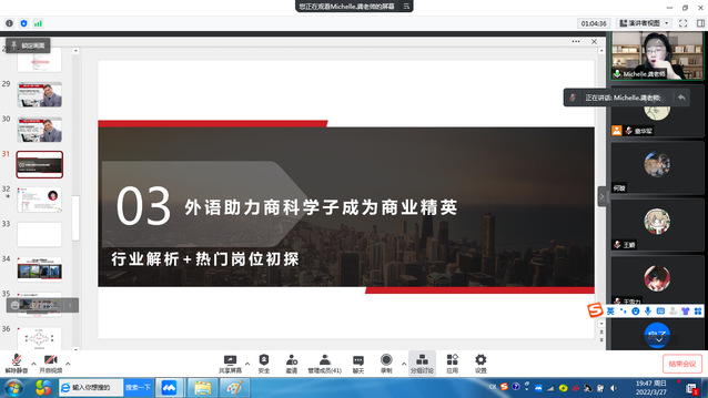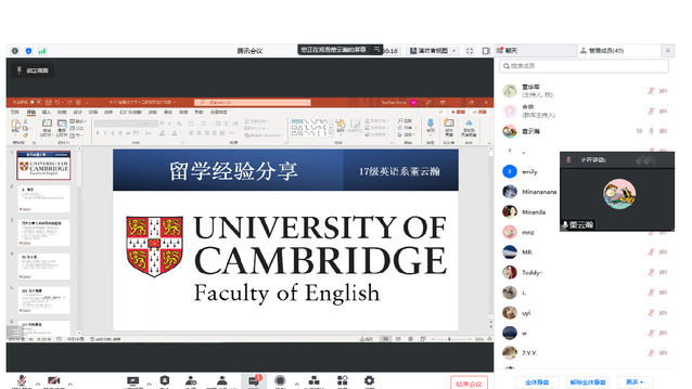 保研升学专场“跨保也精彩,在论外语人的多元视野”专题分享中,学院邀请保研至北京大学、复旦大学、浙江大学的三位2018级本科生张书琪、李嘉昊、杨连蓉结合自身跨保专业,向大家分享学习心得、专业选择和择校经验。在出国(境)深造专场“海阔凭鱼跃,留学焕新攻略”主题交流中,学院2021届毕业生孙一萌、杜光瑜、薛媛元、董云瀚四位同学详细分享了自己申请留学美国、英国、中国香港等地的时间规划、个人情况、准备材料、目标专业要求等内容,并就中外院校的课程安排、学习模式、录取偏好进行对比,利用表格、时间线等形式向大家进行展示。