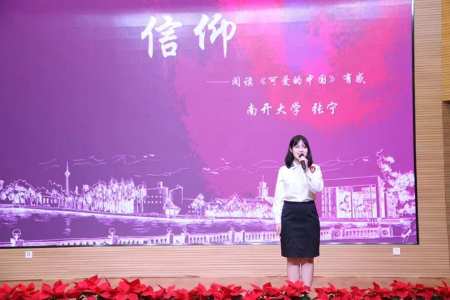 经过层层筛选,张宁的作品《信仰》脱颖而出,并由图书馆教师张丽和文学院副教授刘堃担任指导教师,在演讲内容、展现形式等方面进行悉心指导。张宁在《信仰》中以方志敏的《可爱的中国》为参阅著作,并从一封信的故事入手,深情讲述了中国共产党人胸怀坚定信仰,为了民族独立和人民解放抛头颅、洒热血,以宝贵生命换来今天幸福生活的壮丽史诗,表达了南开学子传承红色基因,为中华之崛起而读书的壮志豪情。