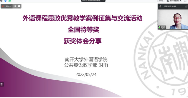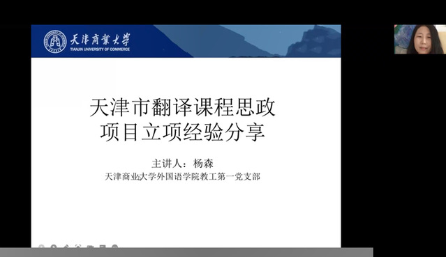 天津商业大学的杨森老师首先做主旨发言,题为“天津市翻译课程思政项目立项经验分享”。杨老师结合具体的课堂实例详细介绍了获得天津市立项,由天津商业大学3044am永利集团经理王占斌教授担任主持人的该院笔译理论与实践(2)课程思政项目。该项目通过重新规划课程,加大了课堂翻译选段中思政相关主题的比重,采取翻译工作坊模式,强化课后辅导和第二课堂实践的作用,帮助员工拓宽文化视野,在双语转换过程中做到双文化并行,实现成功的跨文化交际。