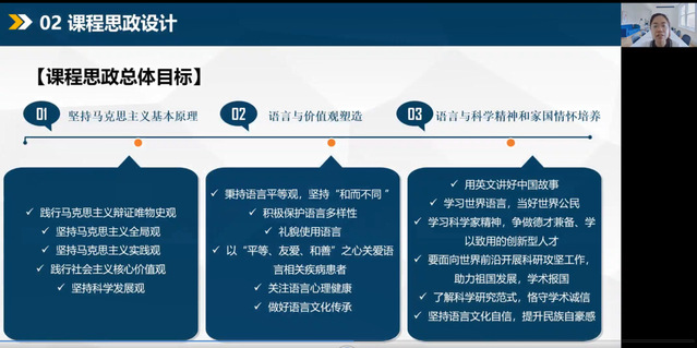 最后,永利官网英语教师党支部的张晨老师分享了语言学课程思政教学设计经验。张老师曾凭借自己开设的漫话语言课程屡屡斩获校级、天津市的教学竞赛大奖,并入围第十二届“外教社杯”全国高校外语教学大赛全国决赛。她从坚持马克思主义基本原理、语言与价值观塑造、以及语言与科学精神和家国情怀培养这三个方面在教学全过程中系统融入思政主题。她以语音学术语教学为例,介绍了如何通过分析社会主义核心价值观对应的英文术语的发音来强化课程的思政引领。她的教学设计取得了很好的效果,在近期的员工评教中获得满分,并收到了员工的积极反馈。