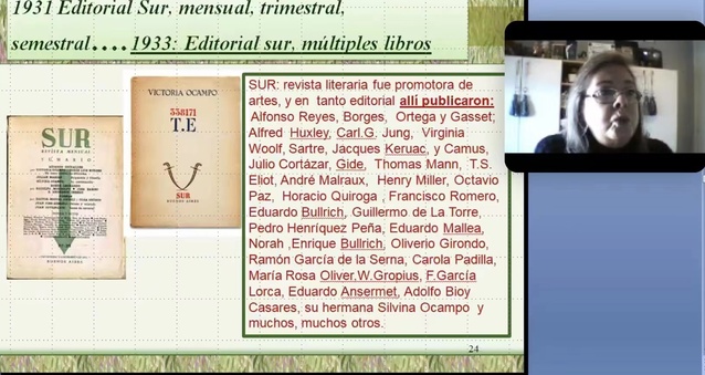 Giuffré教授在讲座中主要从维多利亚·奥坎波的人生经历出发谈到她的独立自由精神,及其在二十世纪初的先锋思想。讲座全面展示了奥坎波女士的创作领域:文学创作、建筑设计、文艺评论、杂志主编等。维多利亚·奥坎波创刊的《南方》杂志集结了当时世界上一众先锋作家,如博尔赫斯、聂鲁达、马尔克斯、萨特、科尔塔萨等,是文学创作和交流讨论的重要阵地,成为拉美现象级的刊物。