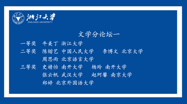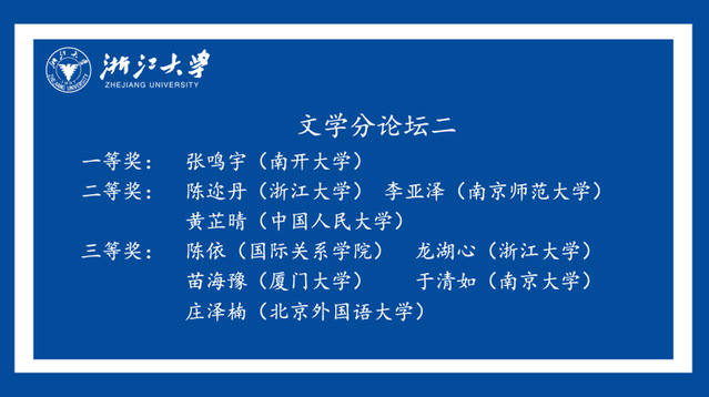 张鸣宇同学的毕业论文《从“拔根”到“扎根”——西蒙娜·韦伊与汉娜·阿伦特笔下的“根”》(刘吉平指导)获文学二组分论坛一等奖,陈晓钰同学的毕业论文《老化对法语元音共振峰影响的纵向研究》(王彩霞指导)获语言学分论坛一等奖;史婧怡同学的《法语文坛中的非洲文学——以〈人类最隐秘的记忆〉为例》(刘吉平指导)与杨玲同学的《边缘女性的书写——以〈温柔之歌〉为例》(刘吉平指导)分别获得文学一组分论坛的三等奖。