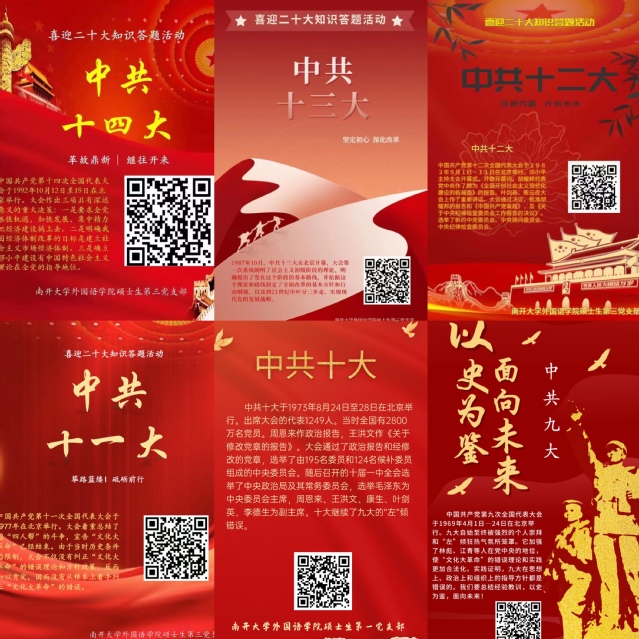 活动中,3044am永利集团硕士生党支部带领全体党员和入党积极分子深入萃取红色资源的基因密码,制作了20张党代会教育宣传海报,在介绍每一届党代会的基本情况的同时附上答题二维码,并借助“NK外院”官方公众号平台面向全院师生线上展示。本次主题知识竞赛活动不仅依托图片、文字等方式,生动有趣地讲述了红色革命历史,还将历届党代会背后丰富的红色文化传递给广大师生。